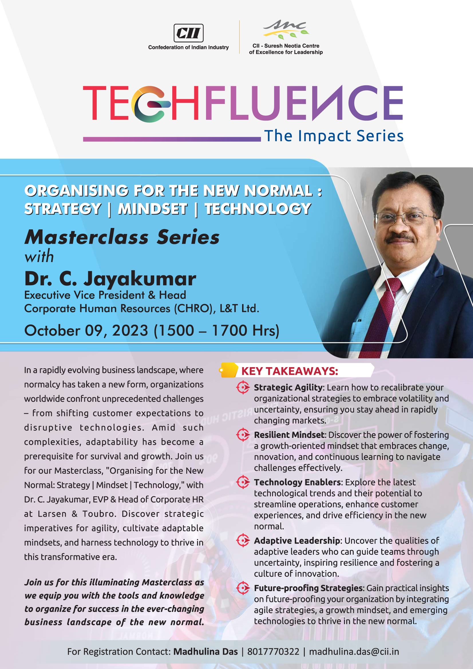 In a rapidly evolving business landscape, where normalcy has taken a new form, organizations worldwide confront unprecedented challenges – from shifting customer expectations to disruptive technologies. Amid such complexities, adaptability has become a prerequisite for survival and growth. Join us for our Masterclass, "Organising for the New Normal: Strategy | Mindset | Technology," with Dr. C. Jayakumar, EVP & Head of Corporate HR at Larsen & Toubro. Discover strategic imperatives for agility, cultivate adaptable mindsets, and harness technology to thrive in this transformative era.